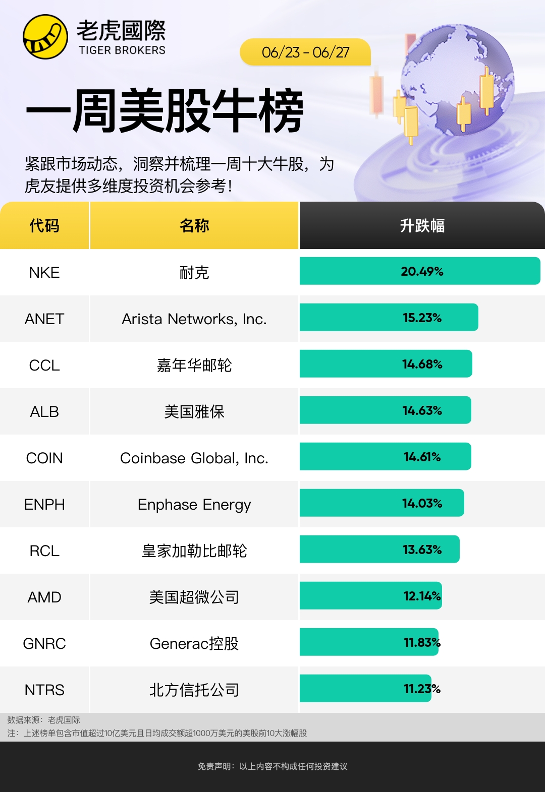 上週哪些股票表現優異,以下是截至6月27日當週標普500指數漲幅前十的股票: