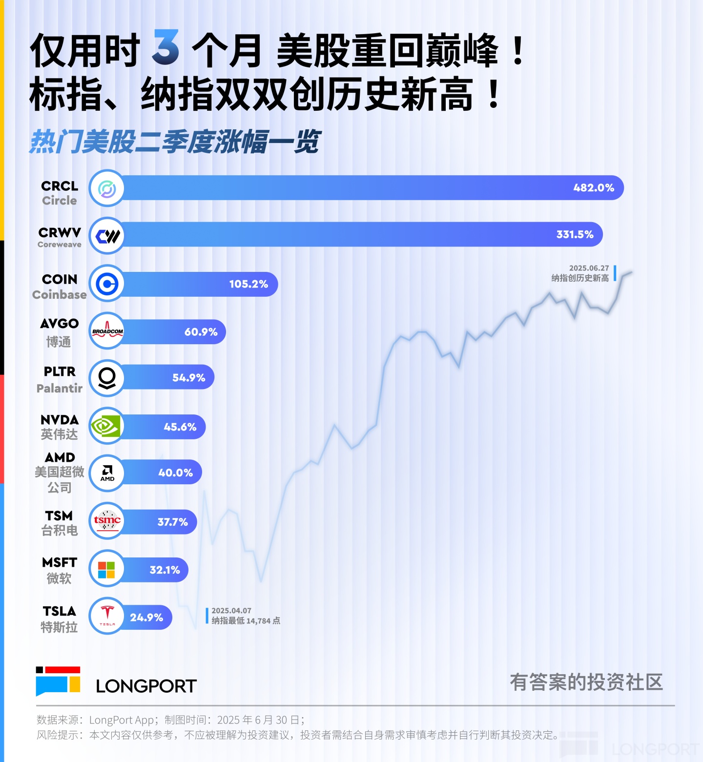 4 月 7 日至 6 月 27 日的反彈,依然由科技股領導,本輪市場熱門交易股包括但不限於:$Circle(CRCL.US) 、$Coreweave(CRWV.US) 、$Coinbase(COIN.US) 、$博通(AVGO.US) 、$Palantir Tech(PLTR.US) 、$英偉達(NVDA.US) 、$AMD(AMD.US) 、$臺積電(TSM.US) 、$微軟(MSFT.US) 、$特斯拉(TSLA.US) :