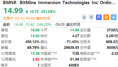 華盛資訊6月30日訊,BitMine Immersion $BMNR 股價飆升超250%,消息面上,華爾街策略師湯姆・李(Tom Lee)已被任命爲比特幣礦企 BitMine Immersion Technologies 的董事會主席,自週一起生效。