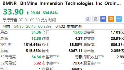 Bitmine $BMNR 盤前續漲超60%,隔夜曾暴漲超694%;BitMine完成2.5億美元私募融資,擬用資金增持以太坊作爲核心儲備資產,同時維持比特幣挖礦業務。華爾街策略師湯姆·李(Tom Lee)任其董事會主席,將推動公司向以太坊專注的財務公司轉型,採用ETH作爲其主要的儲備資產。
