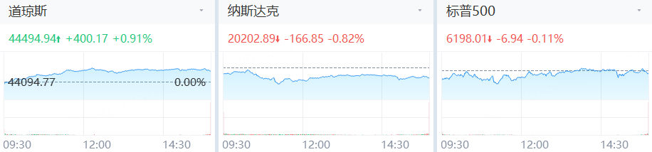美東時間週二,美股三大指數指數走勢分化。截至收盤,道瓊斯指數漲0.91%,報44,494.94點;標普500指數跌0.11%,報6,198.01點;納斯達克指數跌0.82%,報20,202.89點。