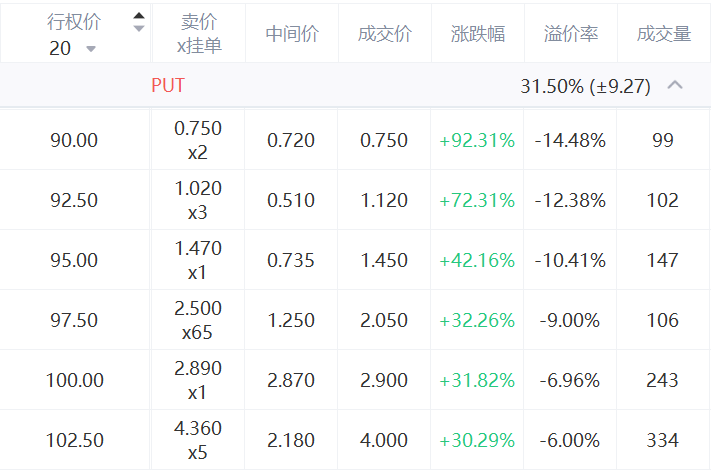 週一早盤 理想汽車-W 跌超2%,截止午間收盤報104.4港元,期權鏈上Put單全線走高,成交量最高的是7月30日到期行權價102.5港元的Put單,半日漲幅30.29%,同日到期行權價90港元的 $理想 250730 90.00 PUT$ 漲幅達92.31%: