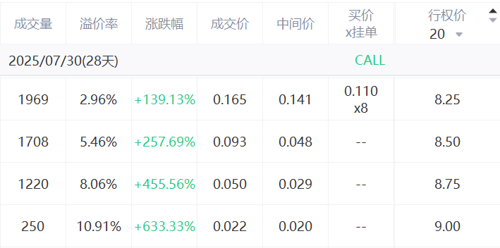期權鏈上Call單集體飆升,成交量最高的是7月30日到期行權價8.25港元的認購期權,半日漲幅139.13%,同日到期行權價9港元的 $建行 250730 9.00 CALL$ 半日漲幅高達633.33%!