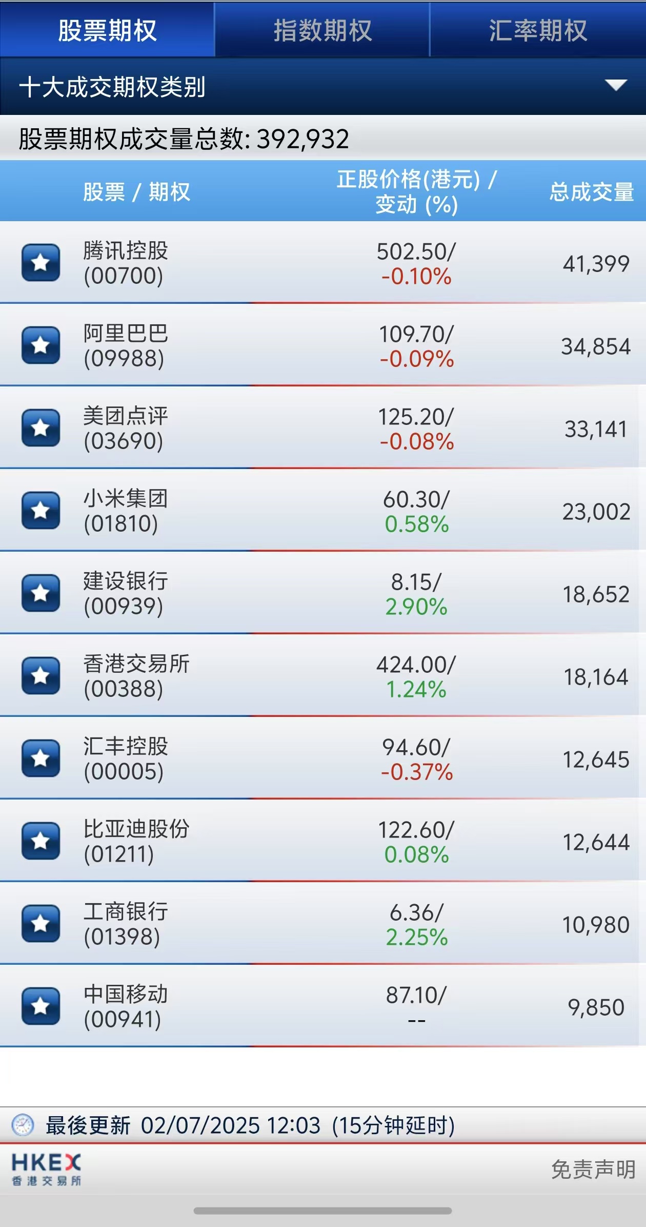 本週二(7月1日)截止午間收盤,港股期權半日成交量達到392,932張,其中 騰訊控股 個股期權成交量最大,達4.1萬張; 阿里巴巴-W 名列次席,期權成交3.5萬張; 美團-W 居第三,期權成交3.3萬張。