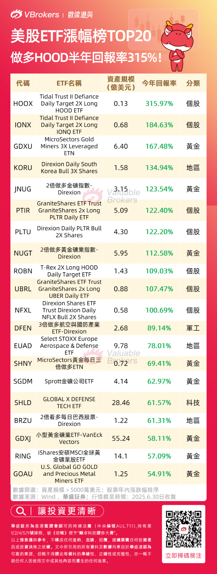 回顧這半年,在美股ETF市場上的投資回報可謂驚人,做多個股類ETF成最大贏家,2倍做多Robinhood ETF $HOOX 強勢佔領漲幅榜首位,2倍做多IONQ ETF $IONX 緊隨其後;此外,交易最爲活躍的當屬做多黃金ETF。