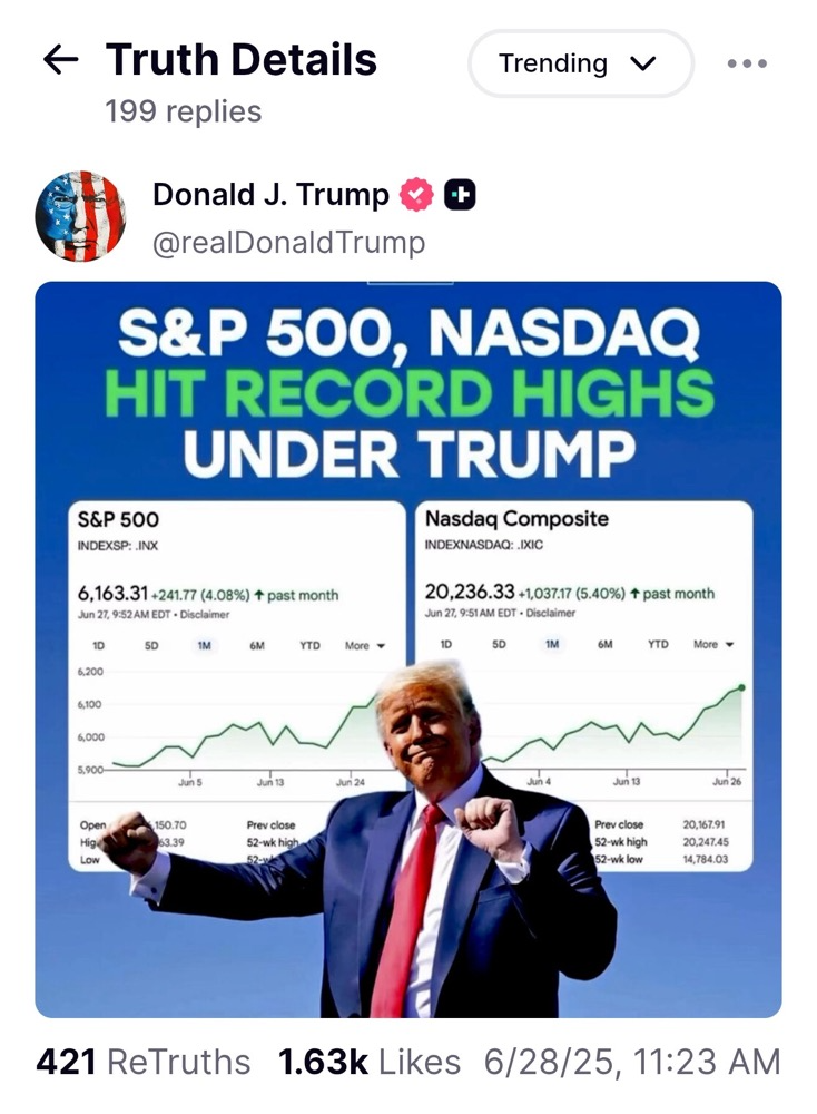 在美股新高後,以至於特朗普也開心在社交媒體上po文,據他發佈的圖片顯示,標普500指數、納指“在特朗普的領導下”齊創新高。美股週五收高,標普500字數突破2025年2月的高點,將紀錄高位推至6187.68點,最終收於6173.07點;納指刷新2024年12月高點至20311.505點,最終收於20273.459點。
