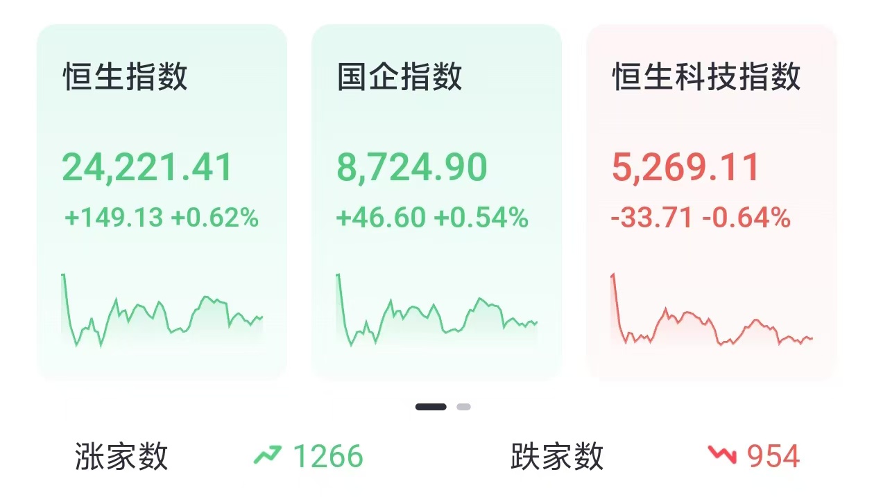 7月2日(週三),港股主要股指今日高開低走,恒生科技指數早盤一度漲超1%,隨後持續下挫,午後一度跌超0.8%。截至收盤,恒指收漲0.62%,恒生科技指數跌0.64%。恒生指數大市成交額達2402.25億港元。