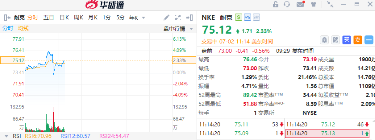 耐克盤中跳水,一度從漲4%跳水轉爲下跌,現回升至2%。