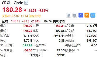 定幣第一股Circle跌超6%,上市以來最高暴漲280%,近7個交易日已大幅回撤31%。消息面上,加密投資機構Castle Funds首席投資官Peter Eberle表示,Circle此次股價回調“並不意外”,此前漲幅過快、過高,“超出了基本面合理區間”。