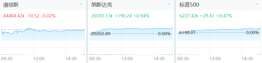 美東時間週三,三大指數僅道指微跌,標普500指數和納指雙雙刷新歷史收盤新高。截至收盤,道瓊斯指數跌0.02%,報44,484.42點;標普500指數漲0.47%,報6,227.42點;納斯達克指數漲0.94%,報20,393.13點。