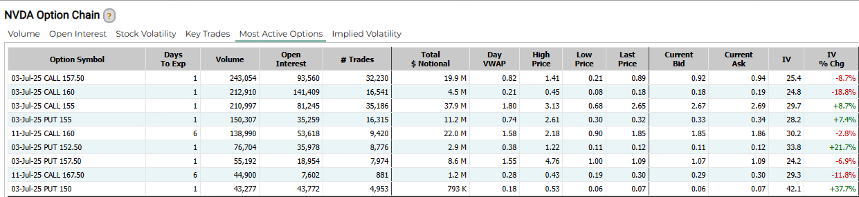 昨日,英偉達漲2.5%,期權合約成交249.51萬張。今日到期的157.5美元看漲期權交易量較高,共有243,054份合約交易。