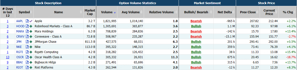 昨日,蘋果上漲2.2%,期權合約成交182.77萬張。其中今日到期的212.5美元看漲期權交易量較高,共有238,949份合約交易。