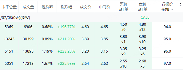 此外,多張於今日到期行權價97美元的看漲期權大漲,漲幅最高超220%!