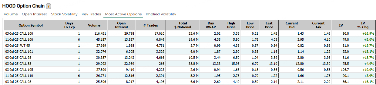昨日,Robinhood大漲6%,期權合約成交較90日平均上漲3.6倍達1,305,691張。其中今日到期的100美元看漲期權交易量較高,共有116,431份合約交易。