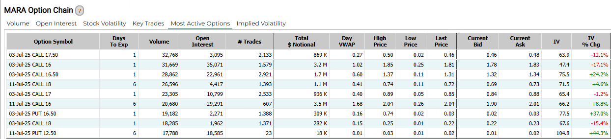 Mara Holdings股價大漲13%,期權合約成交較90日平均暴漲2.5倍達708,839張。其中今日到期的17.5美元看漲期權交易量較高,共有32,768份合約交易。