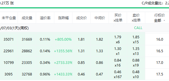 此外,多張於今日到期行權價17美元的看漲期權大漲,漲幅最高超2700%!