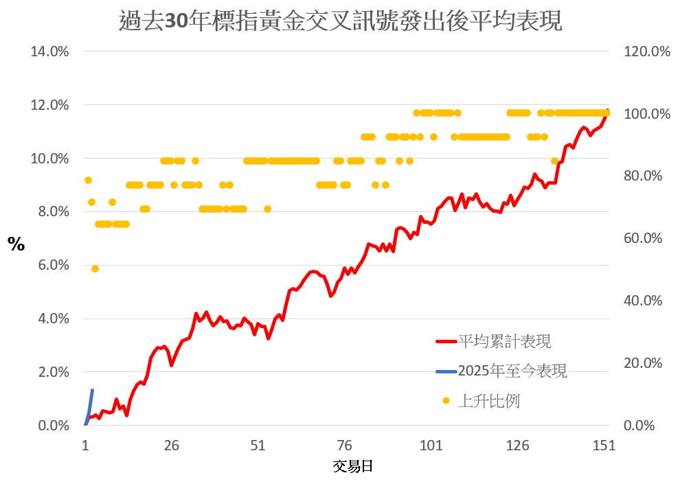 總結而言,僅從此技術指標分析,若以過去30年中14次黃金交叉的歷史表現作參考,除2015年一次被視爲假訊號外,其餘多數均預示標指在黃金交叉出現後有明顯上升動力。由此推斷,標指於今年餘下時間延續升勢的機會相當高。