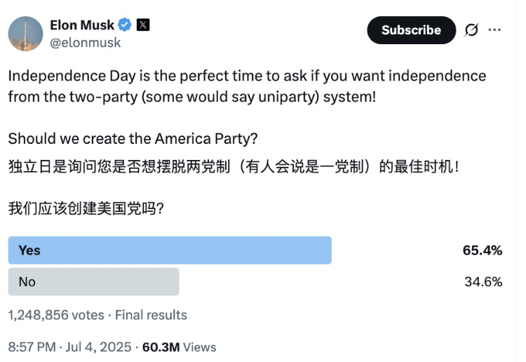 不滿“大而美” 馬斯克“獨立日”再提成立美國新政黨