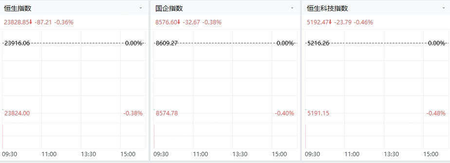 週一(7月7日)三大指數小幅低開,香港恒生指數開盤下跌87.21點,跌幅0.36%,報23828.85點;香港恒生科技指數開盤下跌23.79點,跌幅0.46%,報5192.47點;國企指數7月7日(週一開盤下跌32.67點,跌幅0.38%,報8576.6點。