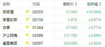 茶飲股走高,茶百道漲超15%,奈雪的茶漲近10%,古茗漲超5%,滬上阿姨、蜜雪集團漲近3%。