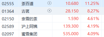 受消息影響,7月7日開盤,港股新式茶飲大幅走高,截至發稿,茶百道漲超10%,古茗漲超8%,奈雪的茶、滬上阿姨、蜜雪集團均漲超4%。