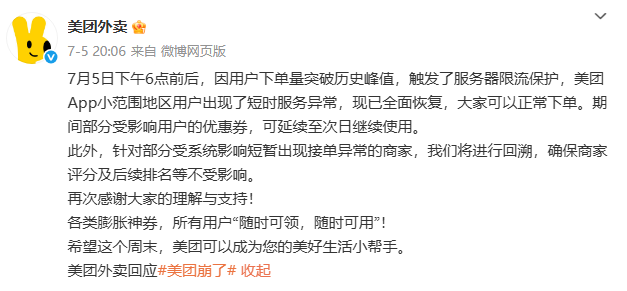 值得注意的是,由於瞬時流量激增,7月5日,“美團崩了”登上熱搜。當日晚間美團外賣發佈微博稱,7月5日下午6點前後,因用戶下單量突破歷史峯值,觸發了服務器限流保護,美團App小範圍地區用戶出現了短時服務異常,已全面恢復。