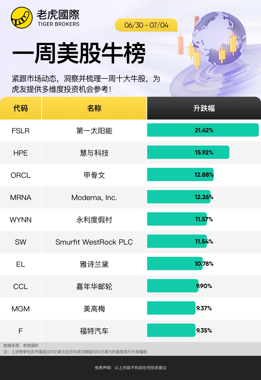 以下是截至7月4日當週,標普500指數中漲幅前十的個股: