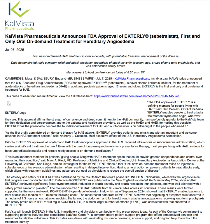 7月7日,KalVista Pharmaceuticals今日宣佈,美國食品藥品監督管理局 (FDA) 已批准 EKTERLY (sebetralstat),這是一種新型血漿激肽酶抑制劑,用於治療12歲及以上成人和兒童患者的遺傳性血管水腫 (HAE) 的急性發作。EKTERLY 是治療 HAE 的首個也是唯一的按需口服治療。消息發佈後,KalVista Pharmaceuticals美股盤前一度飆漲逾35%。