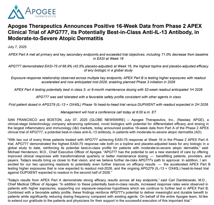 7月7日,Apogee Therapeutics是一家臨牀階段的生物技術公司,致力於推進優化的新型生物製品,具有在最大的炎症和免疫(I&I)市場中差異化療效和給藥的潛力,今天宣佈了APG777的第II期APEX臨牀試驗A部分的16周積極數據。這是一種潛在的最佳類抗IL-13抗體,用於中度至重度特應性皮炎(AD)患者。消息發佈後,Apogee Therapeutics美股盤前一度飆漲逾50%。