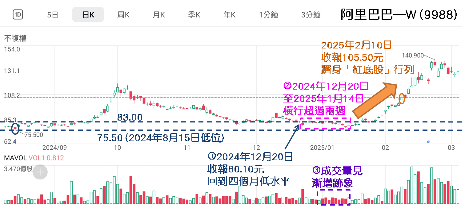 最終在2025年1月15日收報79.95元,較79.85元已見微利,並且自1月16日起未嘗見股價收低於80.00元,事後反映進場時股價已的確在防守性較強定位。於1月27日和2月3日分別收報87.25和94.00元,85.00和90.00元的關口位相繼上破,並於2月4日收報97.65元,連95元關口也上破了,下一關是重要位置100.00元。本文撰寫於2月6日,以2月5日高見99.65元對比1月15日上午收報79.85元,約三週累升近25.00%。考慮到當時港股投資氣氛不俗,相信2月內阿里巴巴會重上100.00元或以上躋身“紅底股”行列。果然,兩個交易日後於2月10日收報105.50元,乎合預期。
