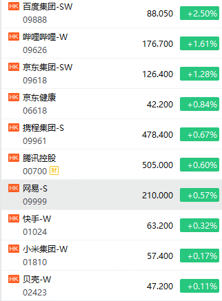 明星科網股多數上漲,百度漲超2%,京東、嗶哩嗶哩漲超1%,阿里、美團跌約1%。