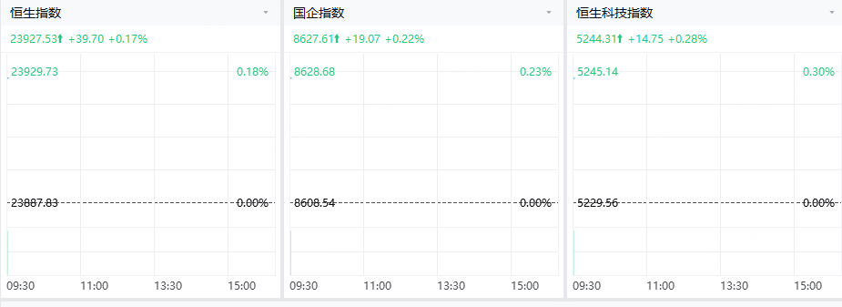 三大指數高開,香港恒生指數開盤上漲39.7點,漲幅0.17%,報23927.53點;香港恒生科技指數開盤上漲14.75點,漲幅0.28%,報5244.31點;國企指數開盤上漲19.07點,漲幅0.22%,報8627.61點。
