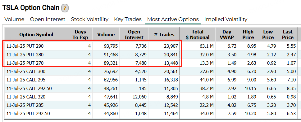 特斯拉昨日成交前三的期權合約都是PUT,到期日均爲本週五。最低行權價爲270美元,較現價有8%左右的跌幅空間。