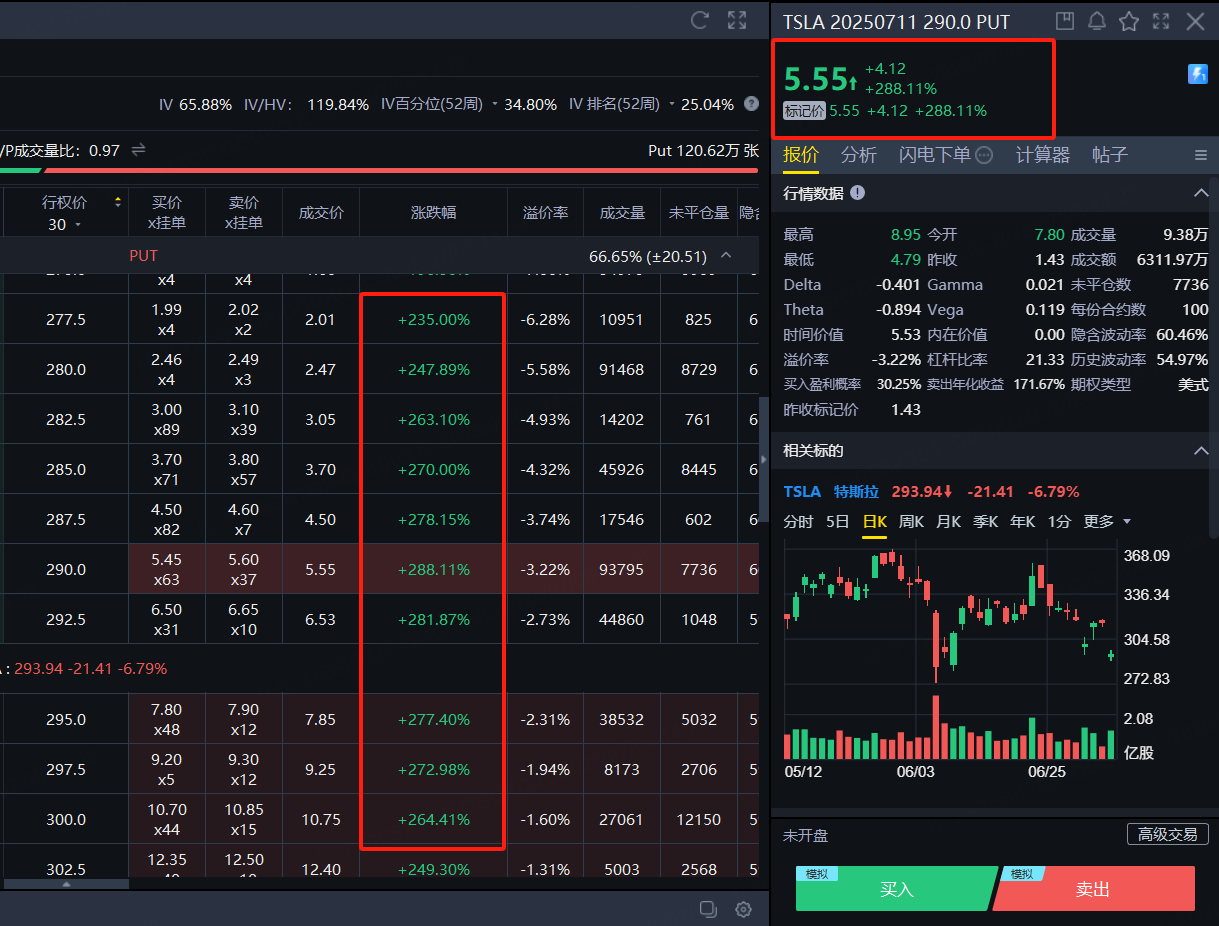 特斯拉PUT的成交價格批量大漲,其中一份本週五到期的行權價290美元的合約,漲幅達288%。