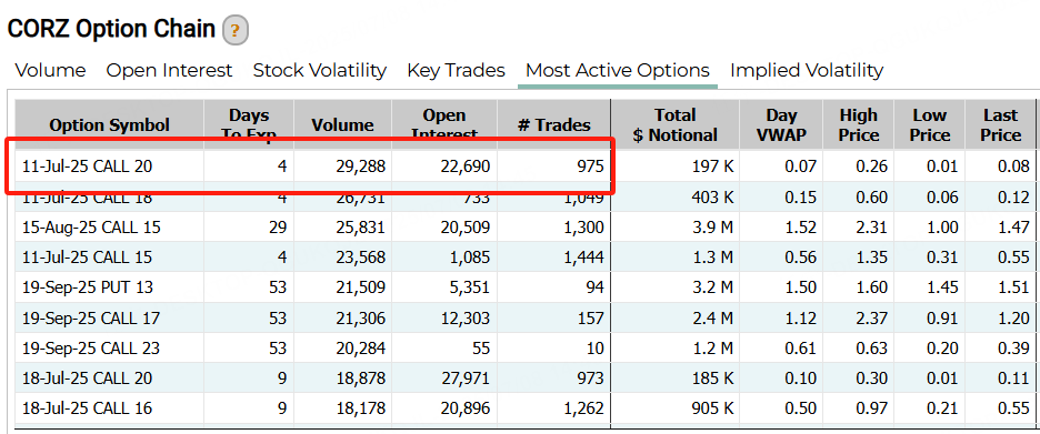 昨日Core Scientific的認購合約成交活躍,排名第一的是一張本週五到期的CALL,行權價20美元,約相當於收購估值。