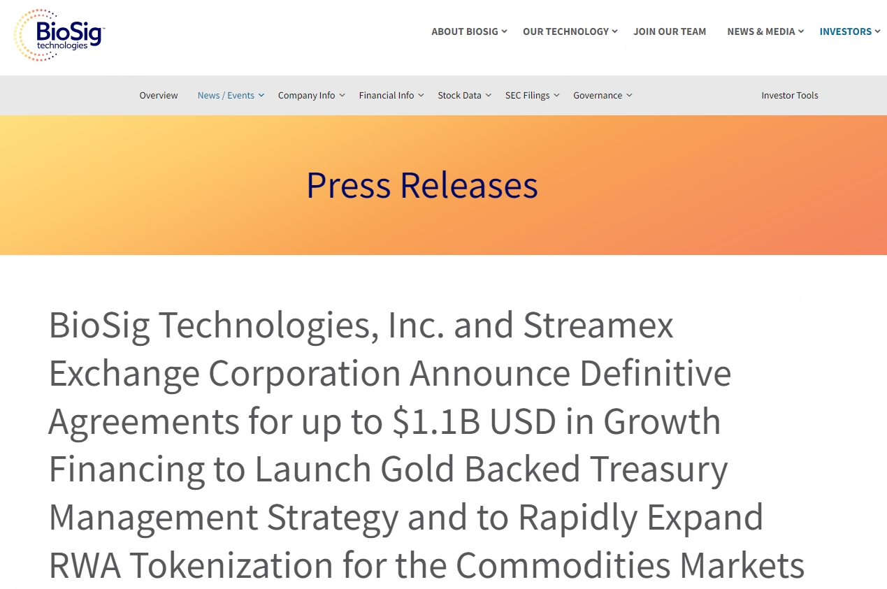 7月8日,醫療設備技術公司BioSig Technologies美股盤前飆漲逾33%!該公司宣佈已與Streamex Exchange Corporation合併,同時還簽署了一項高達11億美元的融資協議,旨在推進RWA代幣化業務發展,推動規模達142萬億美元的大宗商品市場上鍊並重點關注黃金代幣化。