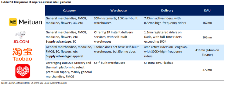 高盛預計,這場外賣大戰將持續較長時間,預計今年9月達到峯值,下半年出現拐點,而短期的外賣虧損是長期營銷投資。阿里外賣業務未來12個月將虧損410億元,京東外賣虧損260億元,美團EBIT利潤將下降250億元。
