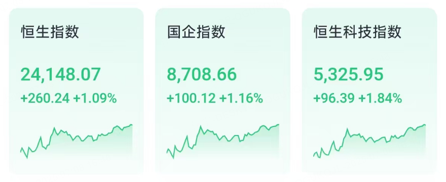7月8日週二,港股三大指數午後持續衝高,恒生科技指數收漲1.84%領先,恒生指數、國企指數分別上漲1.09%及1.16%,恒指漲260點重回24000點上方。