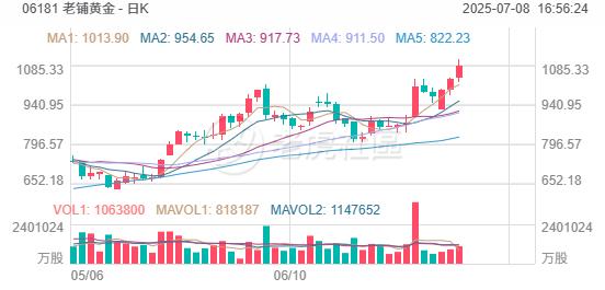 消費股活躍,老鋪黃金今日盤中一度突破1100港元大關,再創歷史新高。同時,布魯可漲7.79%,茶百道漲5.82%,老鋪黃金漲4.54%,泡泡瑪特漲4.09%。