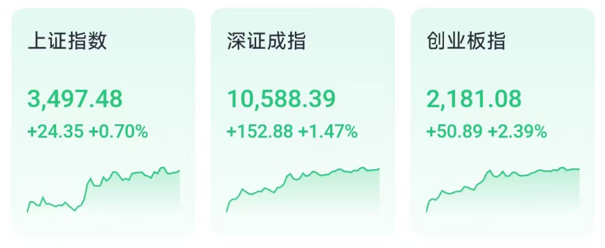 截至收盤,滬指漲0.70%報3497.48點,深成指漲1.47%報10588.39點,創業板指上漲2.39%,報2181.08點。
