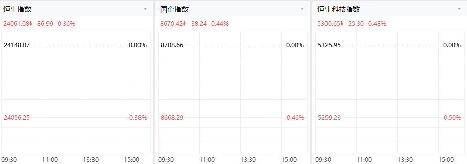 7月9日(週三),港股開盤,香港恒生指數下跌86.99點,跌幅0.36%,報24061.08點;香港恒生科技指數下跌25.3點,跌幅0.48%,報5300.65點;國企指數下跌38.24點,跌幅0.44%,報8670.42點;