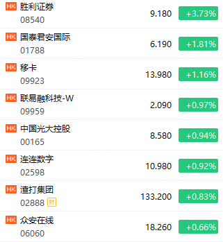 穩定幣概念股高開,勝利證券漲近4%,國泰君安國際、移卡漲超1%。
