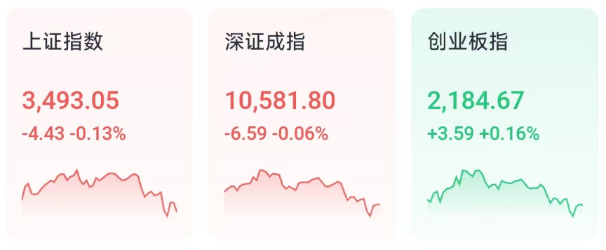 今日市場總體衝高回落,滬指3500點得而復失,創業板指小幅上漲。市場全天成交額超1.5萬億,兩市個股跌多漲少。截至收盤,滬指跌0.13%報3493.05點,成交5960億元;深成指跌0.06%報10581.80點,成交9092億元。創業板指上漲0.16%,報2184.67點。