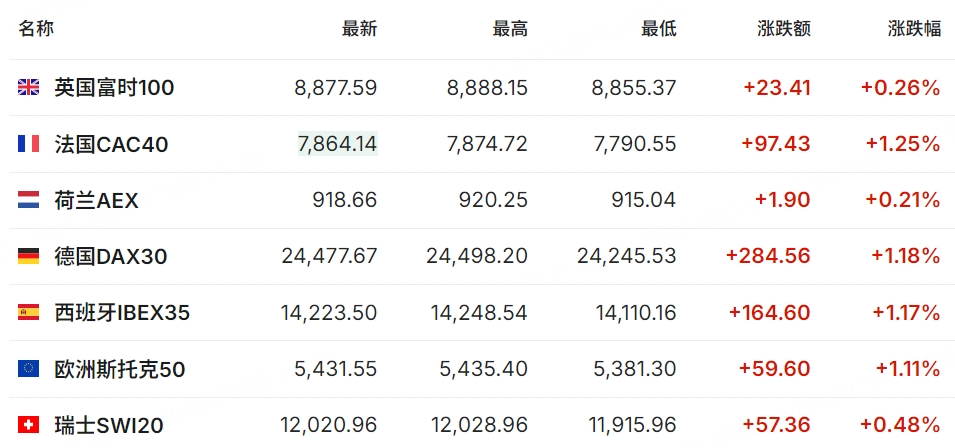 歐洲主要股指全線上漲,截至發稿,英國富時100漲0.26%,法國CAC40漲1.25%,德國DAX30指數漲1.18%。