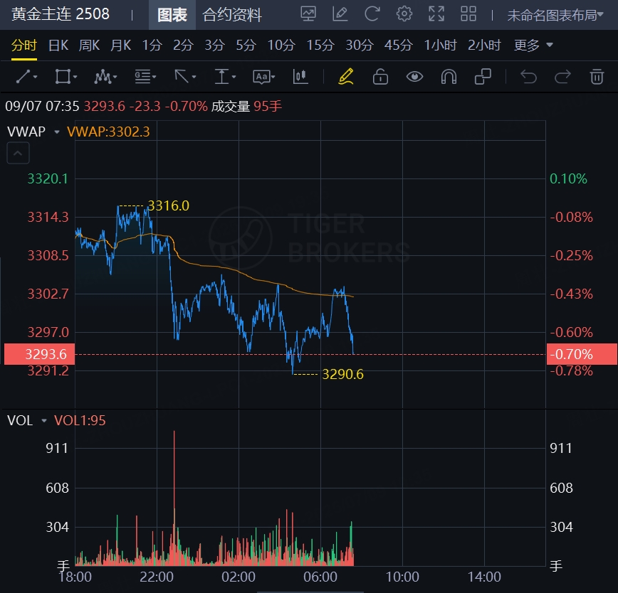 黃金期貨日內走低,截止發稿,跌0.7%,報3293.6美元/盎司。
