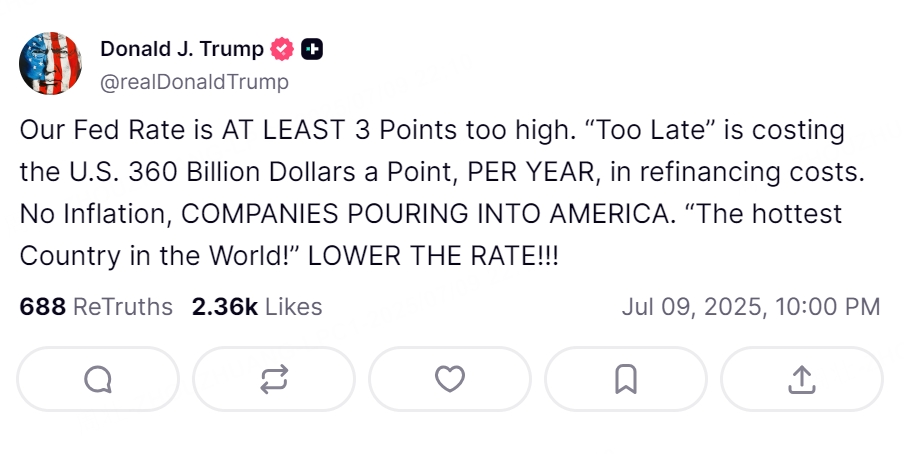 7月9日,特朗普:我們的美聯儲利率至少高了3個百分點。“太遲先生”(鮑威爾)正讓美國每年在每個百分點的再融資成本上損失3600億美元。根本沒有通脹,企業正蜂擁進入美國。快降息吧!!!