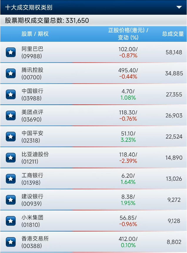港股期權半日成交331650張。其中,阿里巴巴成交量位於榜首,期權成交58148張。騰訊、中國銀行、美團、中國平安、比亞迪等位居其後。
