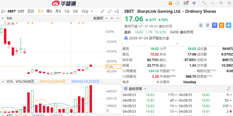 加密貨幣股多數走高,SharpLink $SBET 漲超10%,Coinbase漲超1%。