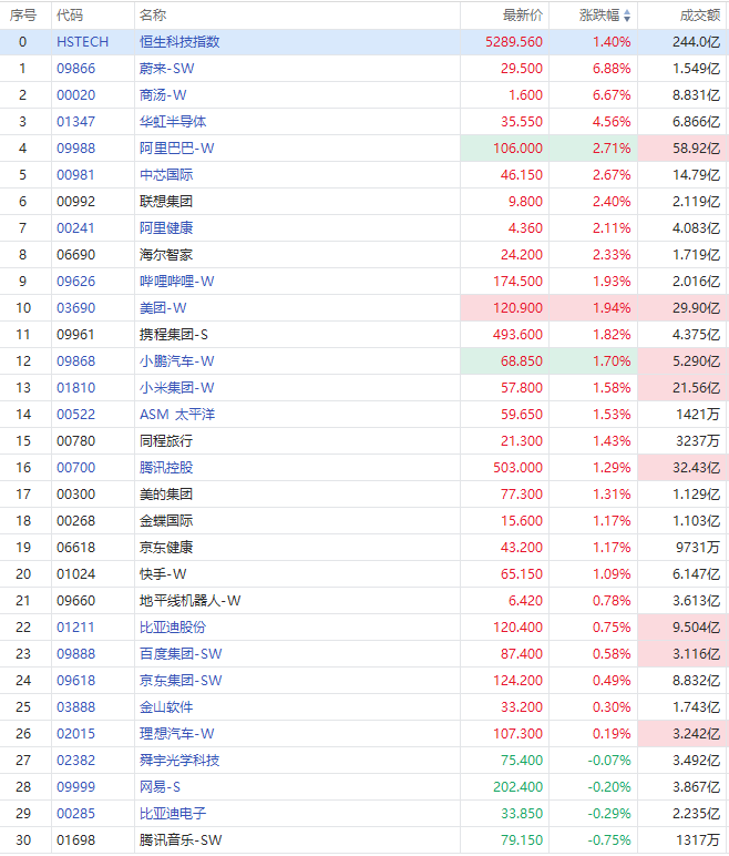 其他成分股方面,商湯-W漲近7%,華虹半導體漲超4%,中芯國際、聯想集團、阿里健康漲超2%。