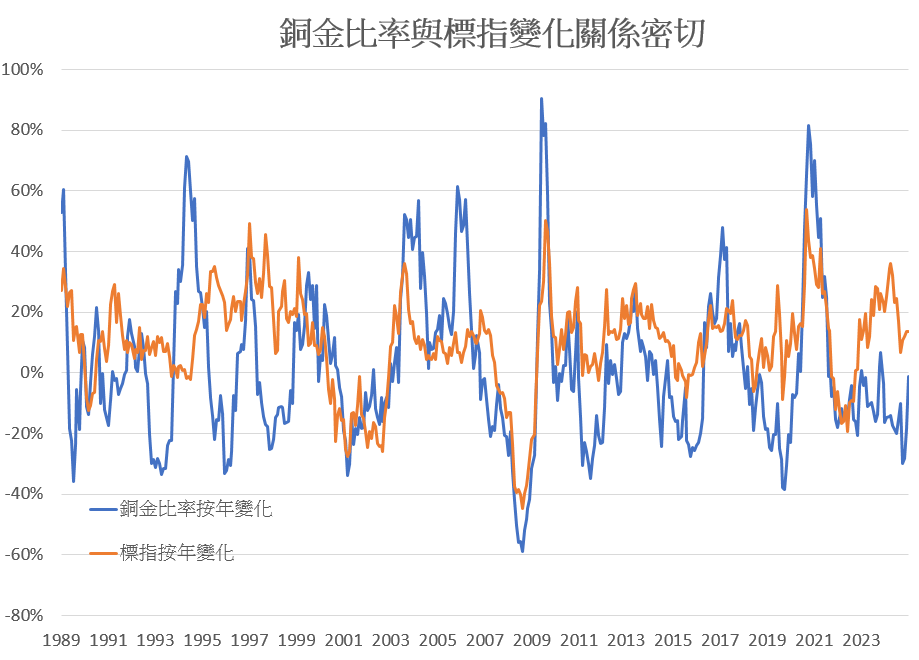 要解答這個問題,不妨從“銅金比率”(Copper-Gold Ratio)談起。如前所述,銅價通常反映全球宏觀經濟的景氣狀況,而黃金則屬避險資產,在市場風險偏好下降、避險情緒升溫時表現較佳。故此,“銅金比率”的變動,某程度可視作全球經濟環境及市場情緒的風向標。